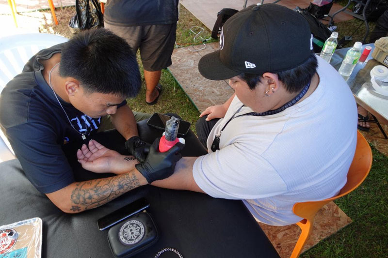 Festivalgoers get inked at the 22nd Annual Tinian Hot Pepper Festival on February 14, 2026, in Tinian, Marianas.