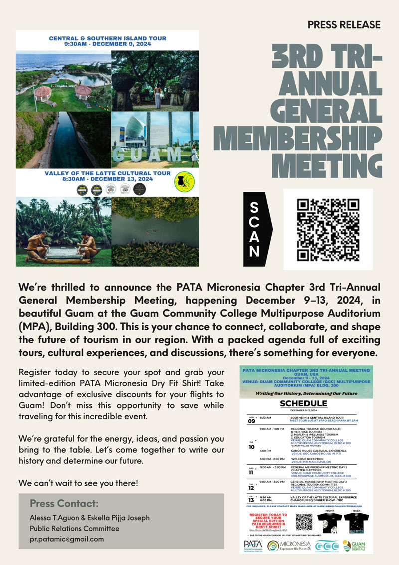 We are excited to share some great news as we prepare for the PATA Micronesia Chapter 3rd Tri-Annual Meeting in Guam, USA, from December 9-12, 2024! Thanks to the dedication and support of our renewed members, we have secured exclusive travel discounts and special rates to make this event as accessible and enjoyable as possible.